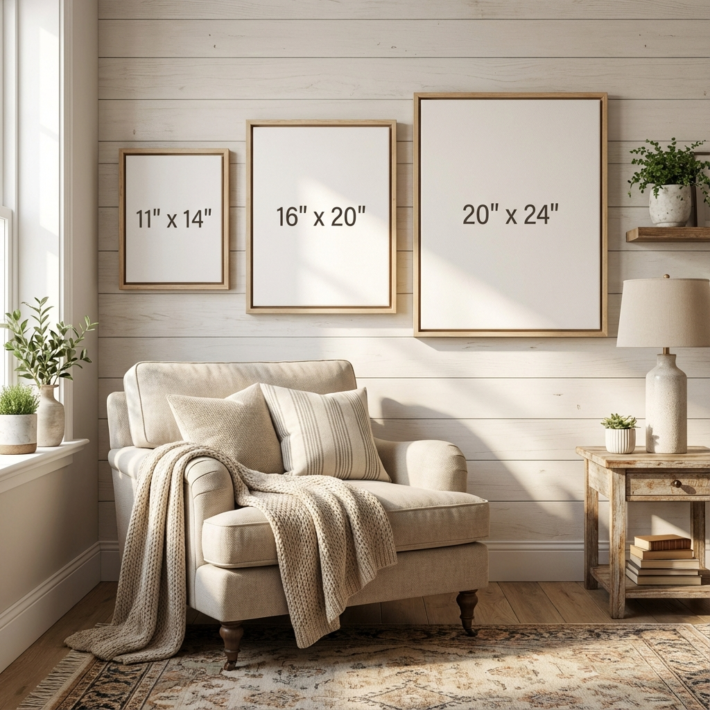 Here's our design secret: Go BIGGER than you think! The most common regret we hear is "I wish I'd ordered the larger size." For gallery walls, a mix of sizes often centered around a few key pieces; 16" x 20" to 24" x 30" for the larger sizes. The smallest pieces could be 8" x 10". For cozy nooks, 11" x 14" to 20" x 24". And for the largest statement size could be 30" x 40". When in doubt, measure your wall space and send us a photo—we'll give you free expert guidance to ensure maximum WOW factor. Please fill up the form "Ask Us A Question" below if you have additional questions or email us at support@heavenandcozy.com and we will do our best to fulfill your special order.