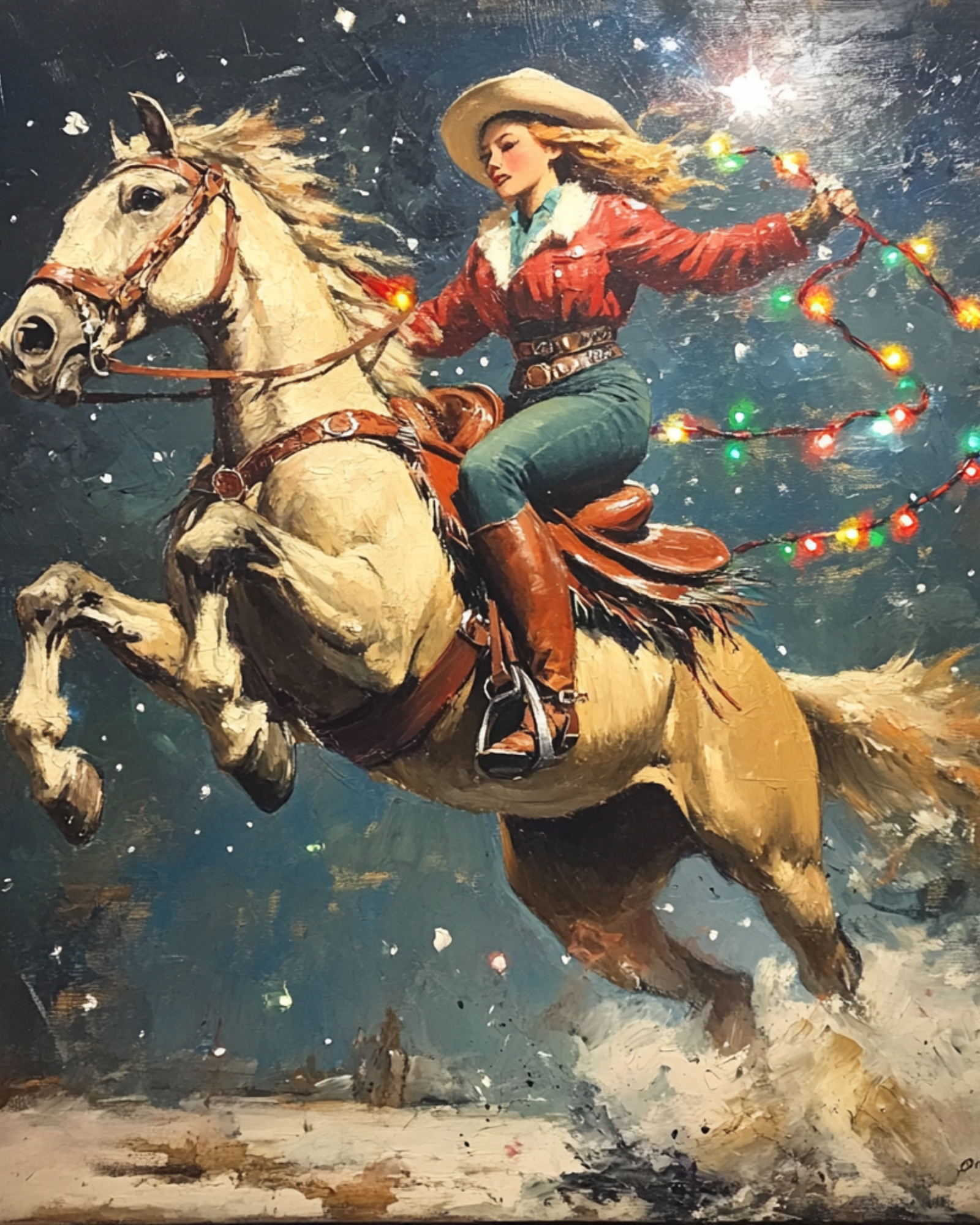 Saddle up for a touch of Western charm this holiday season. This vintage-inspired art print captures the spirit of a fearless cowgirl and her trusted horse, blending timeless frontier elegance with festive Christmas warmth. Perfect for adding character to any room, this piece celebrates independence, adventure, and the magic of the season. Whether you're a true cowgirl at heart or simply drawn to classic Western aesthetics, this print brings nostalgia and inspiration to your walls. Frame it, display it, and let it remind you that the greatest adventures await those brave enough to ride toward their dreams.