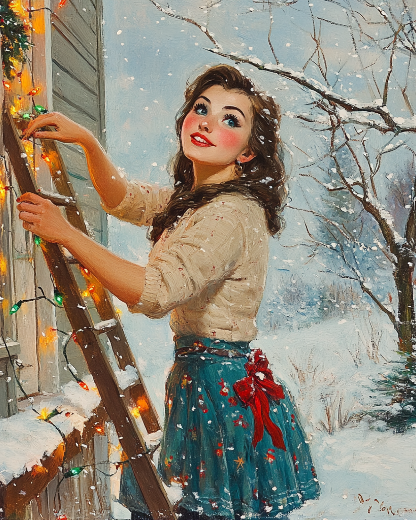 Vintage Girl in Blue with Lights Christmas Art Print