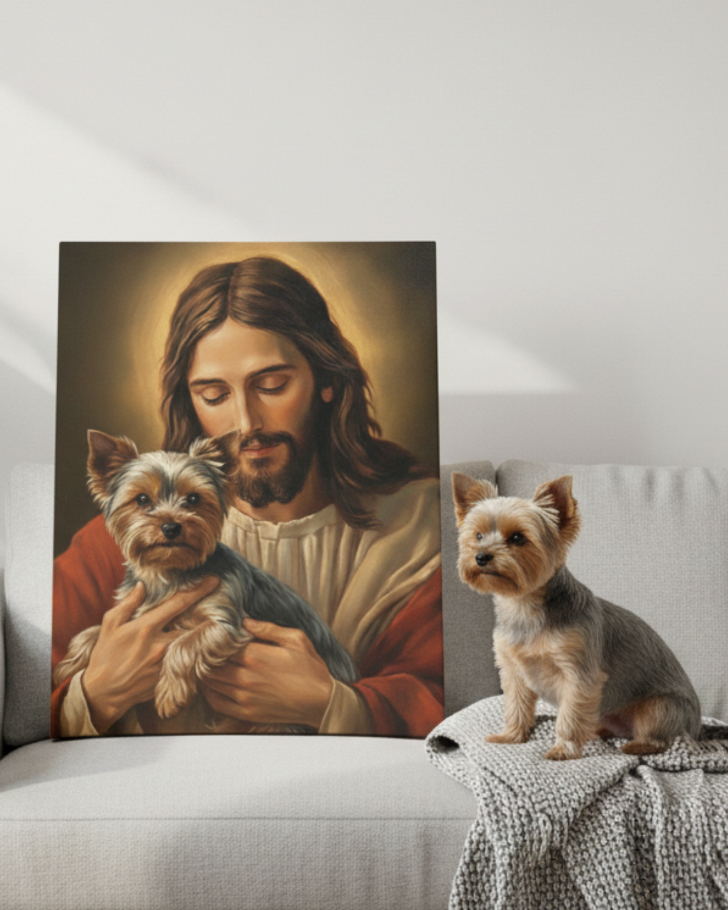 Honor and cherish your beloved pet with our customizable art print. Just upload a picture of your dog or cat using the "Upload Your Pet Photo" button, checkout, and we will do the rest. The final product you will receive will be your own dog/cat lovingly cradled in the arms of Jesus. Let this uplifting artwork remind you daily of faith, comfort, and the gentle companionship our beloved pets bring to our lives.