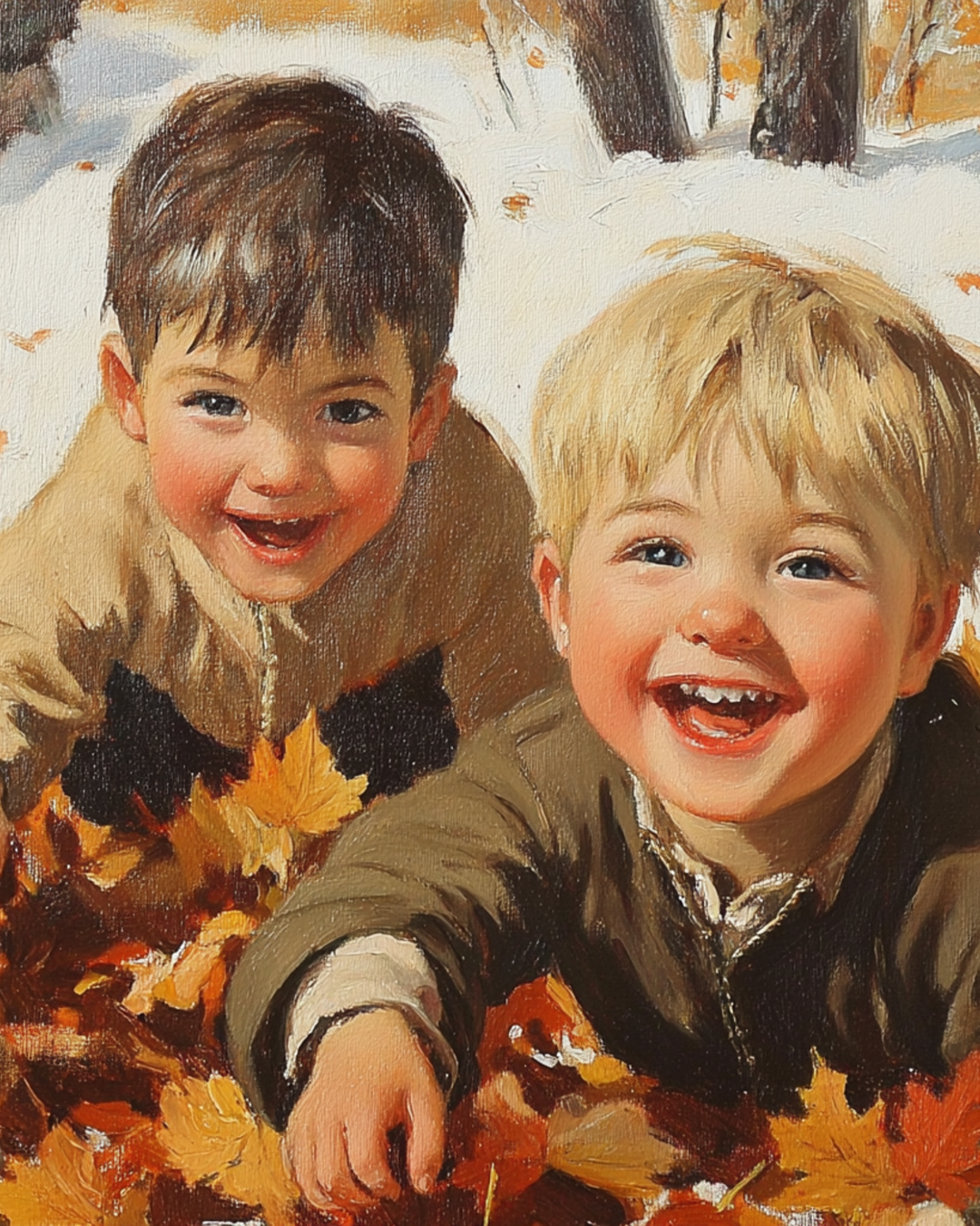 Boys playing in leaves Autumn Winter Art Print