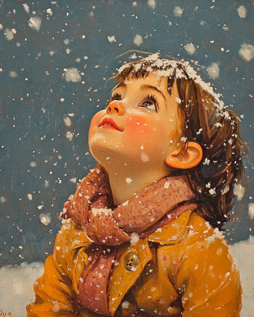 Girl in snow with scarf looking at the sky Winter Art Print