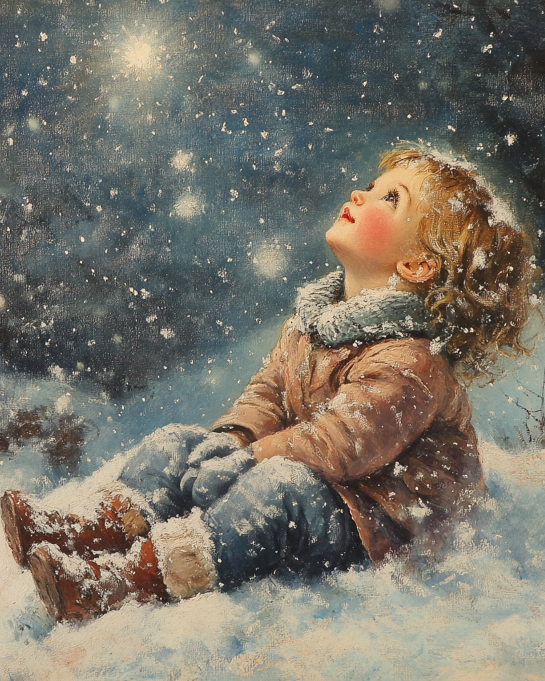 Girl in snow looking at the sky Winter Art Print