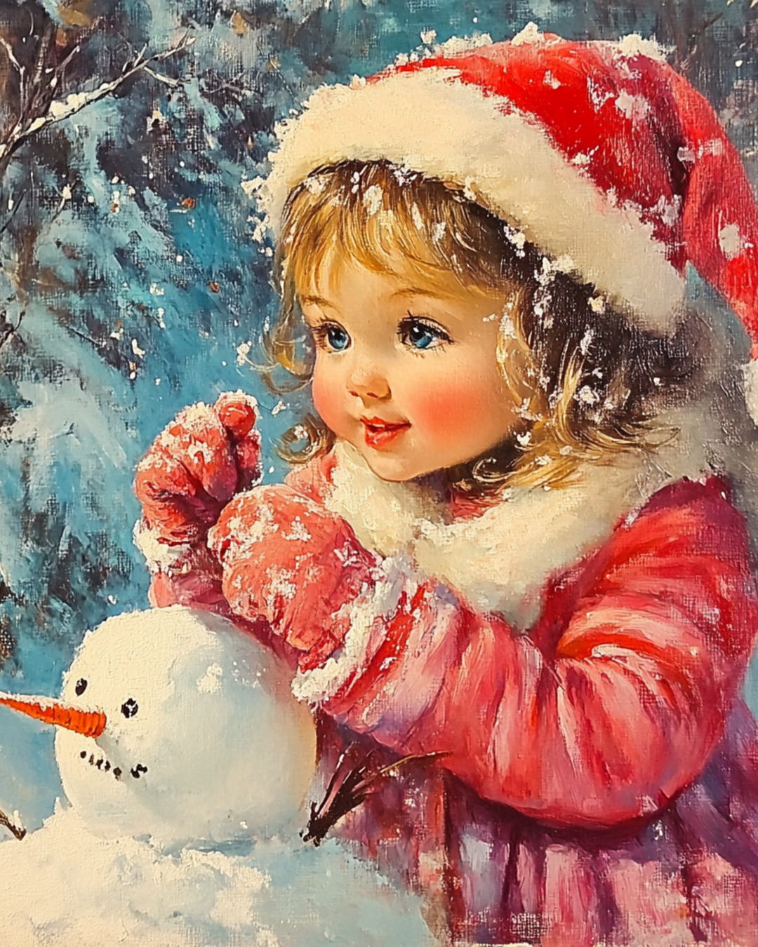Girl building a snowman Winter Art Print