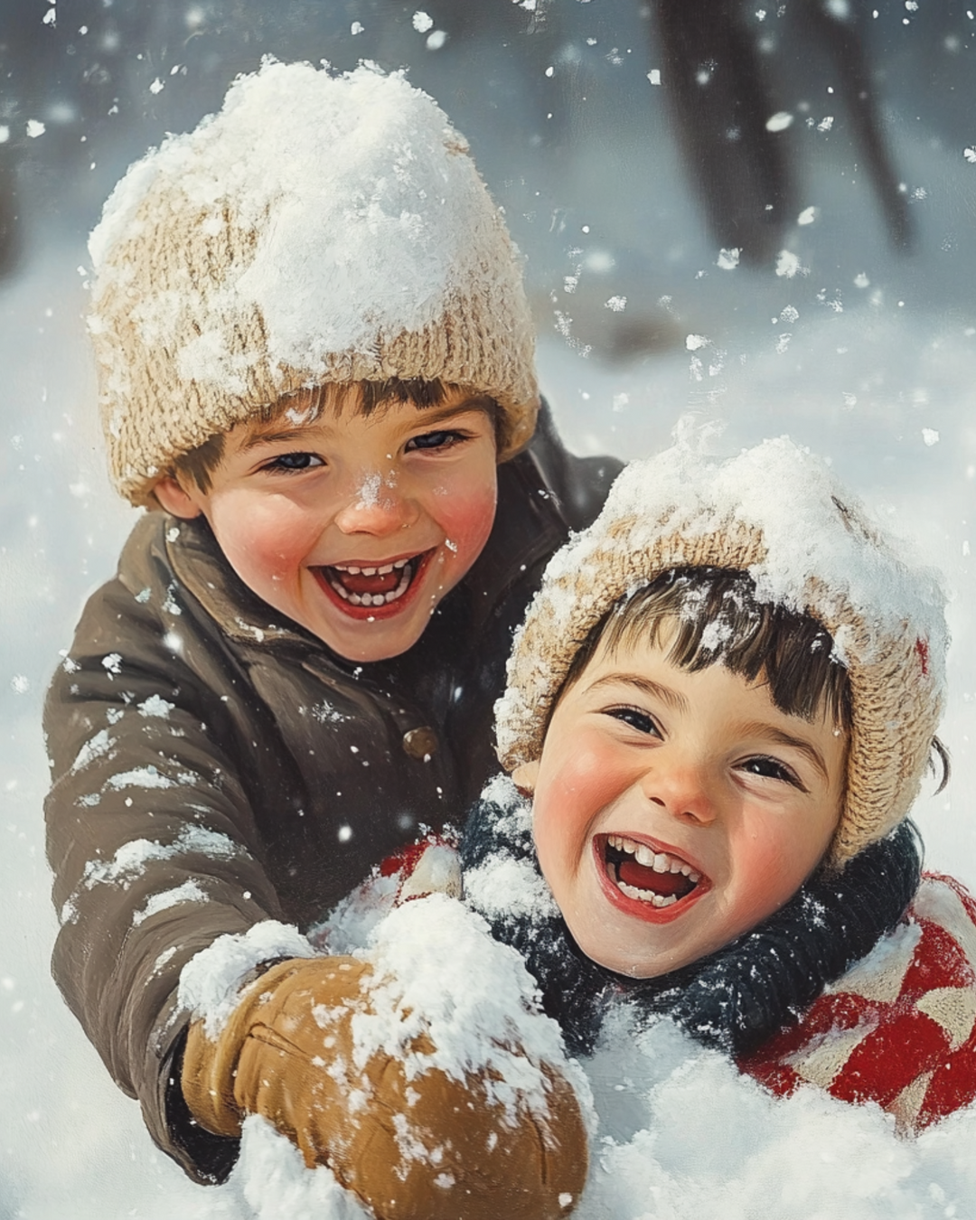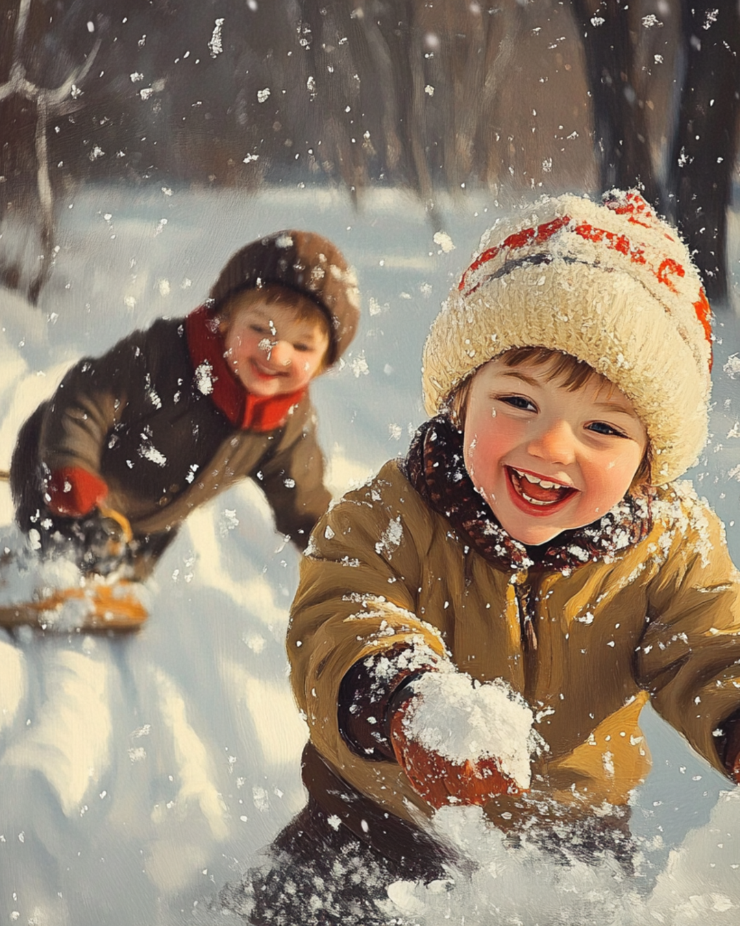 Boys playing in snow Winter Art Print